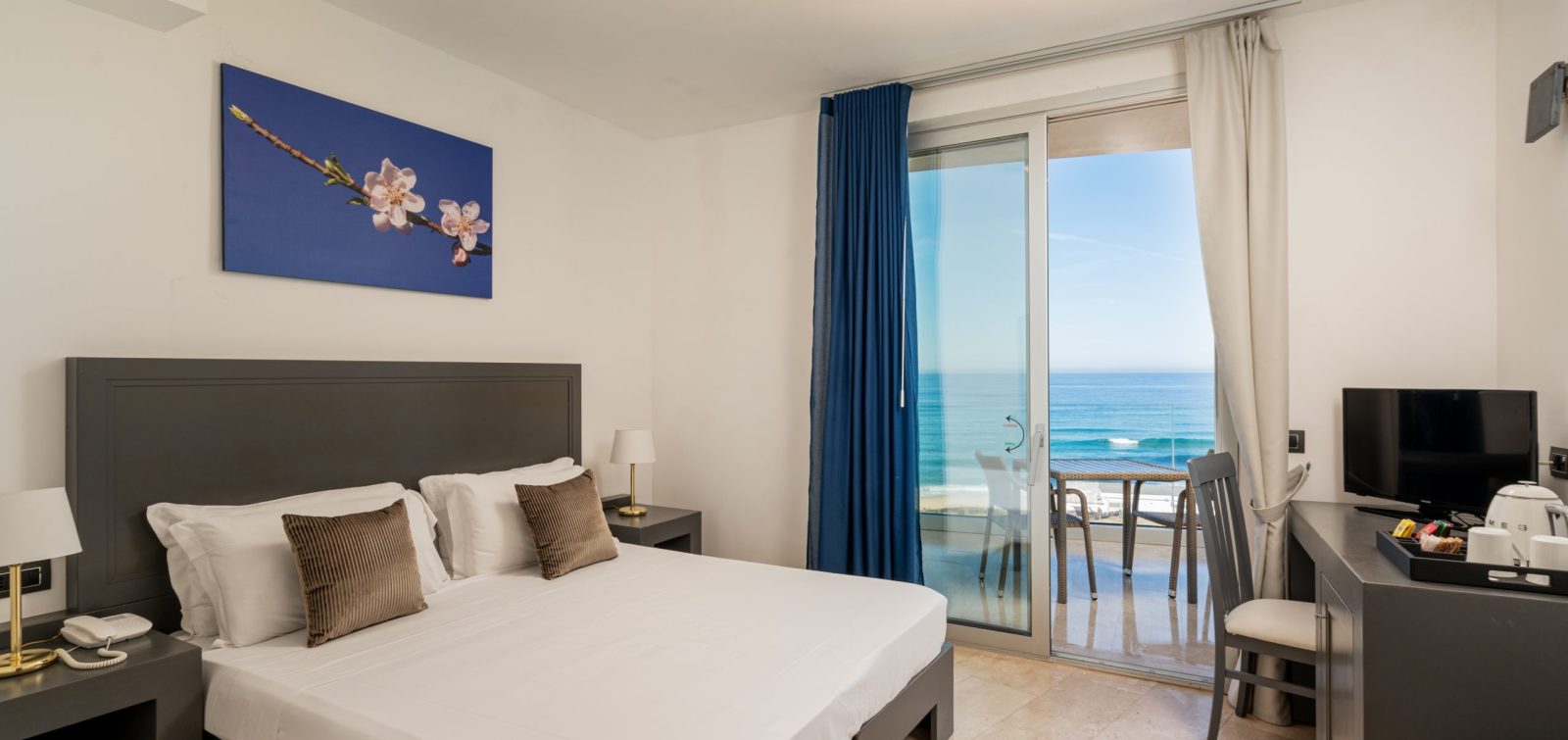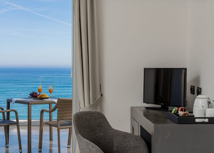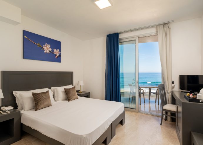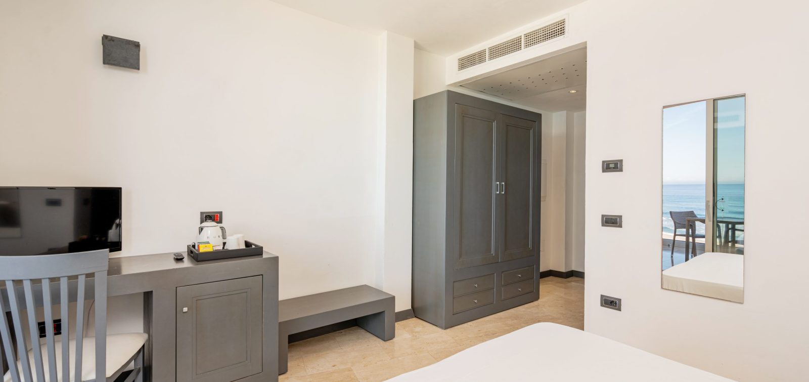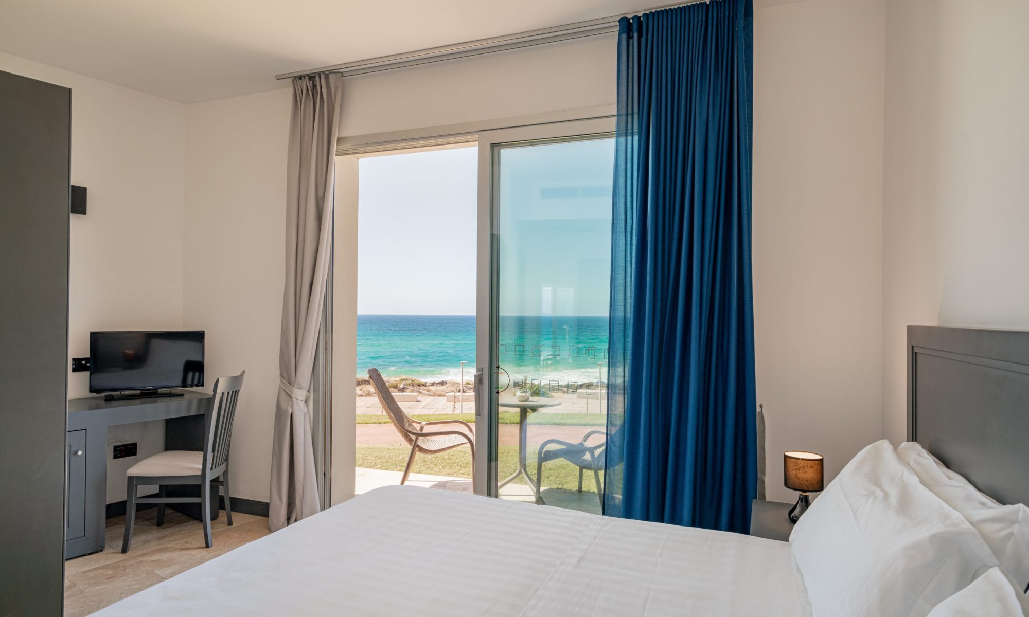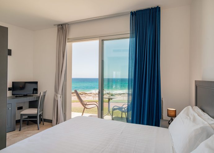 La camera, elegante e luminosa, si affaccia direttamente sul mare, regalando panorami aperti e una sensazione di continuità tra interno ed esterno. Gli ambienti sono curati nei dettagli e arredati in stile mediterraneo contemporaneo, ideali per una vacanza di puro benessere.