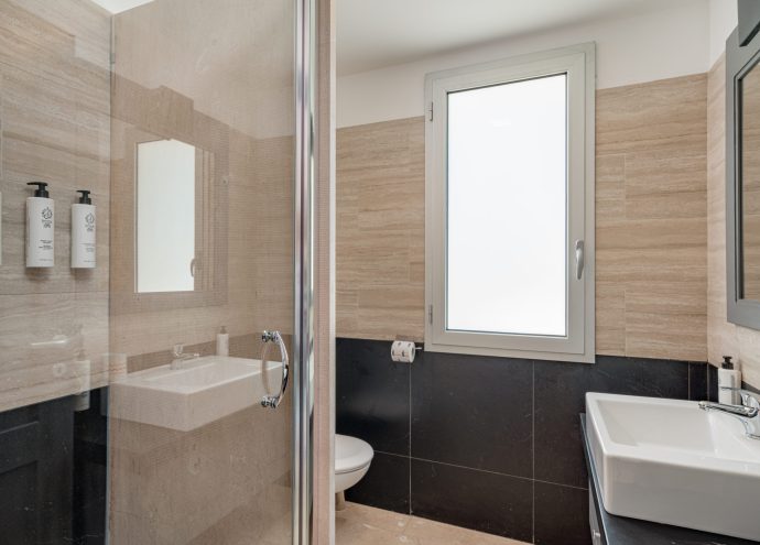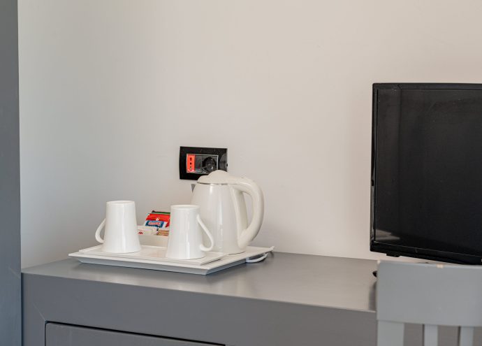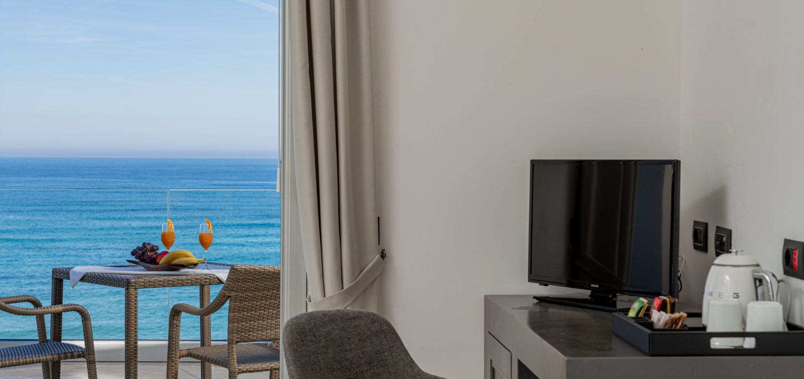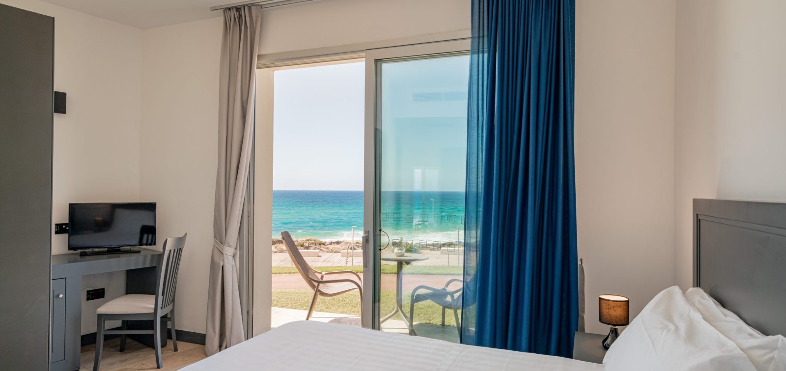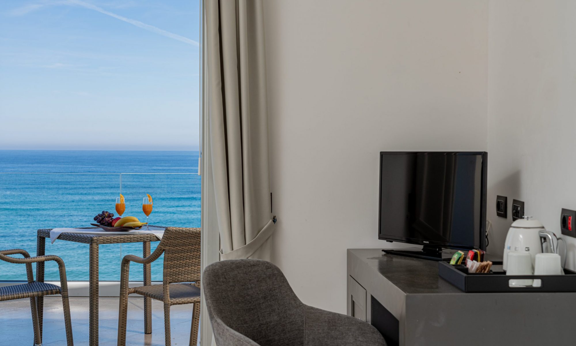 La camera, elegante e luminosa, si affaccia direttamente sul mare, regalando panorami aperti e una sensazione di continuità tra interno ed esterno. Gli ambienti sono curati nei dettagli e arredati in stile mediterraneo contemporaneo, ideali per una vacanza di puro benessere.