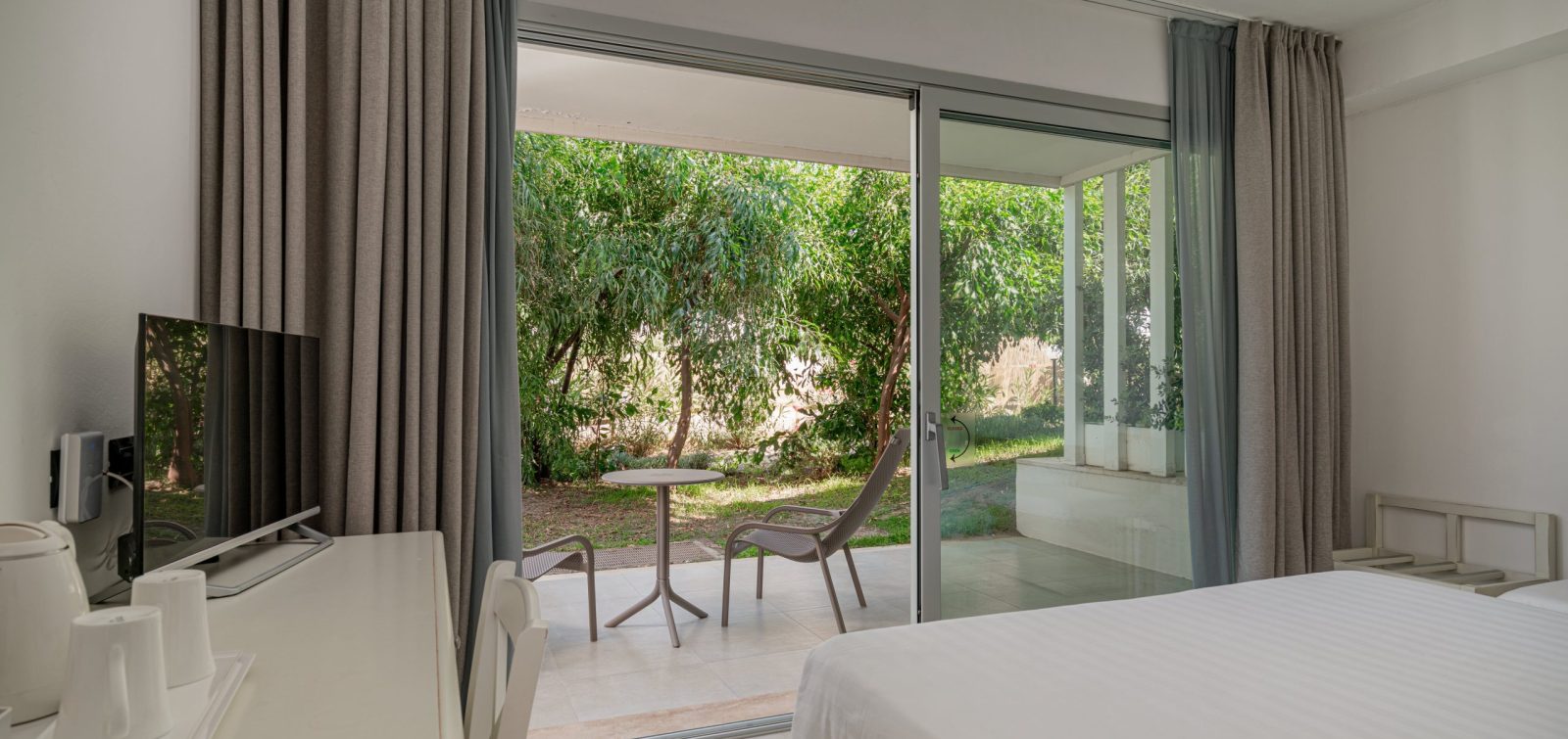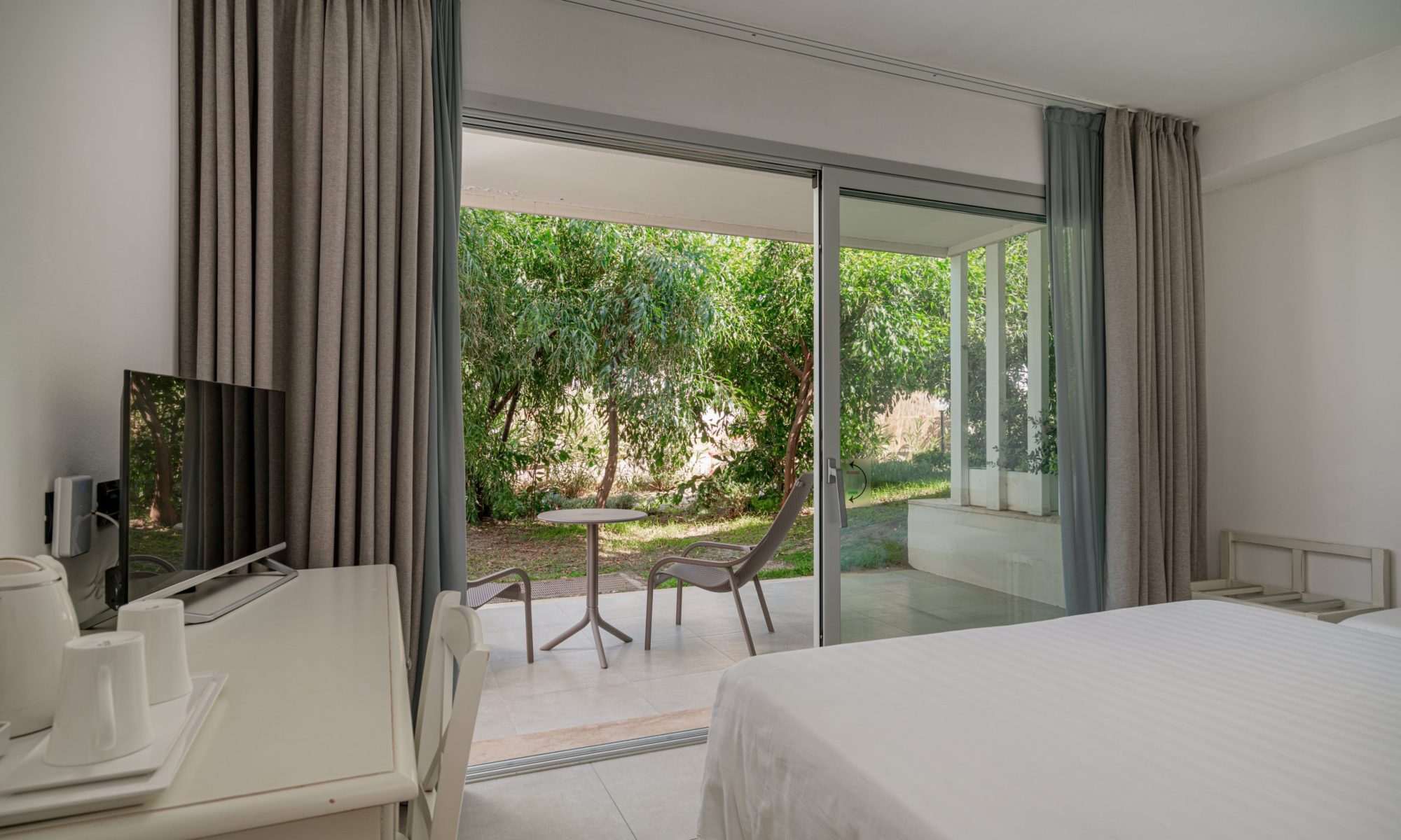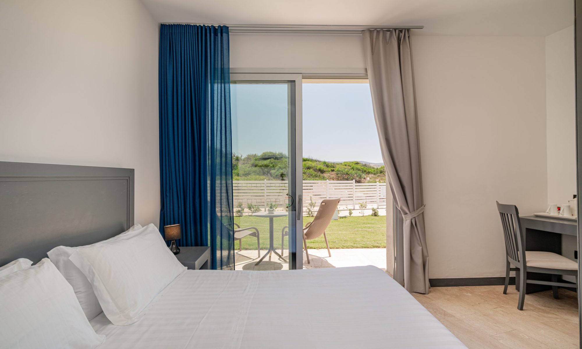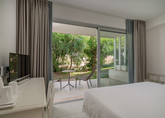 Gli spazi ampi e luminosi, arredati con gusto mediterraneo e curati nei dettagli, si affacciano sul giardino del resort, dove la vegetazione crea un’atmosfera rilassante e rigenerante. Qui il tempo rallenta, accompagnando ogni momento di benessere. Respira… è il tuo spazio di quiete.